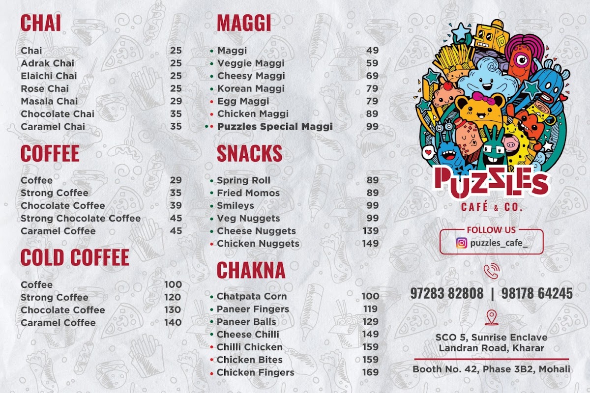 Welcome to Puzzles Cafe, a quaint eatery nestled in Sahibzada Ajit Singh Nagar, where delicious food meets a cozy atmosphere, perfect for hanging out with friends. The menu offers a delightful range of options, catering to various tastes and budgets.